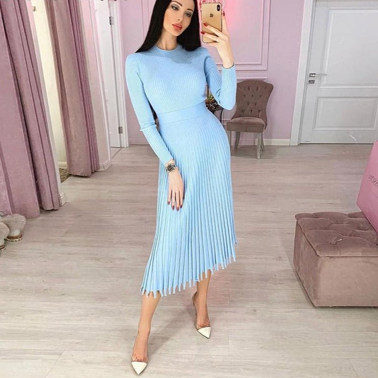 This lovely knit sweater dress has a pleated skirt, beautiful hemline detail, and long sleeves with a mock turtleneck. Available in a variety of colors.