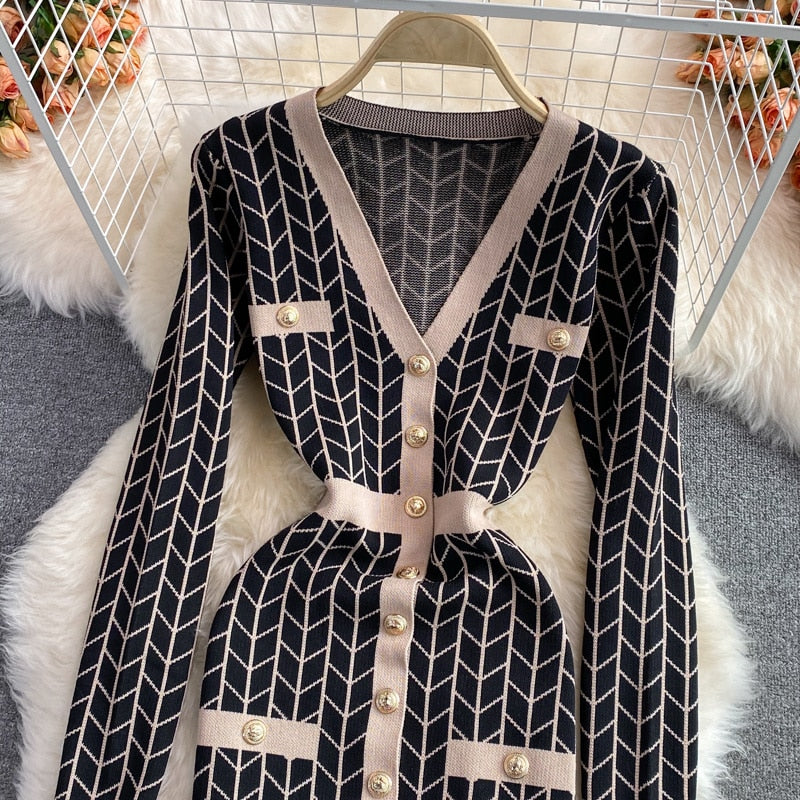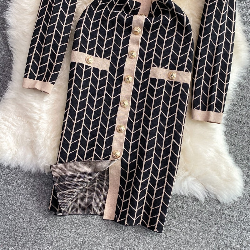 A certain staple in any wardrobe, our CLARA long sleeved knit dress comes in a herringbone pattern in contrasting black and tan for a subtle, yet elegant classic. The sheath silhouette and luxurious stretch knit fabric combine for a flawlessly polished look. Contrasting edging and gold buttons finish off this elegant and easy dress.