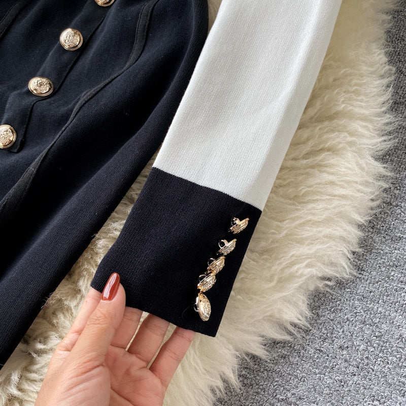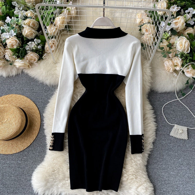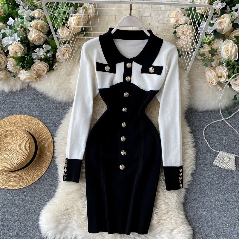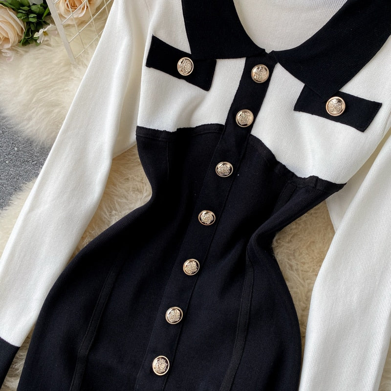 Rhianna black and white lightweight knit dress. Collar, long sleeved, with button detail.