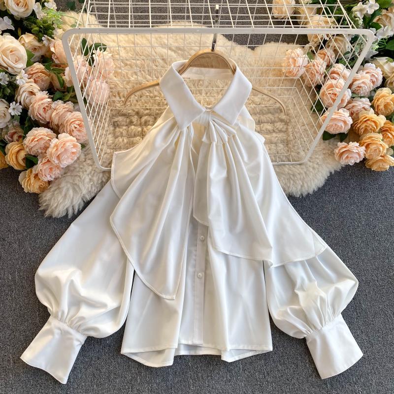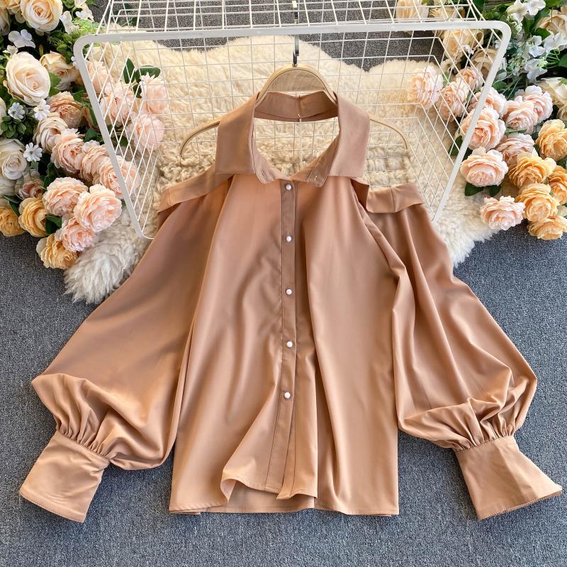 Classy blouse with a sexy feature. This long lantern sleeved, button down, collared shirt has shoulder cutouts for a sexy flair. Comes in a variety of solid colors.