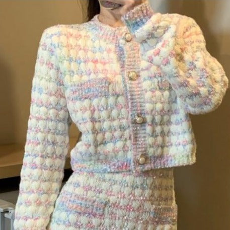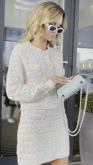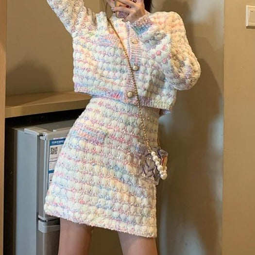 Two-piece tweed pastel skirt set. Skirt is above-knee and cardigan is button down.