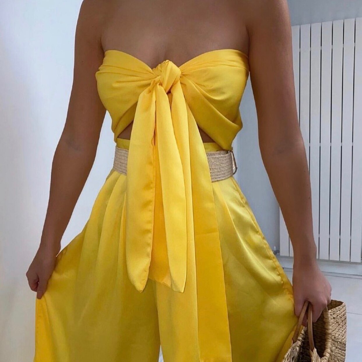 This sexy yet flattering high waist pant and crop/wrap set is perfection on every figure.  Available in a variety of delicious candy colors, you will stun in this gorgeous satin set.
