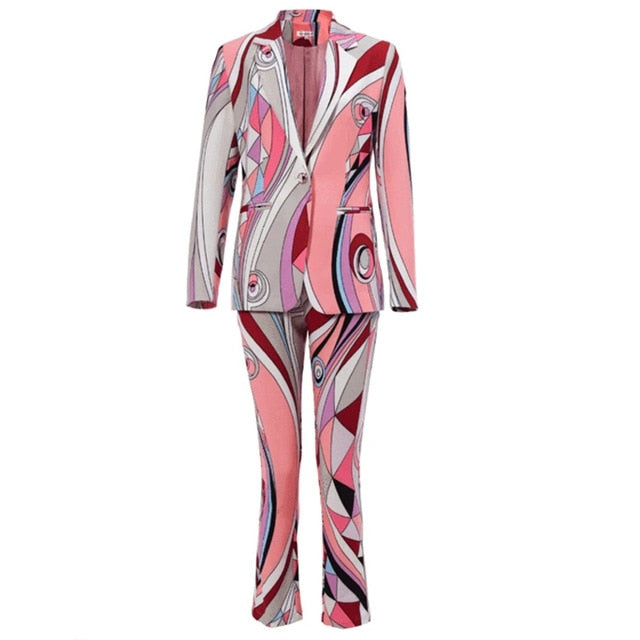 You can literally stop traffic in this bright and colorful geometric retro-print pant suit.  Knit fabric and wlastic waistband make this a perfect fit for any figure.  Blazer feature single-breasted button closure.